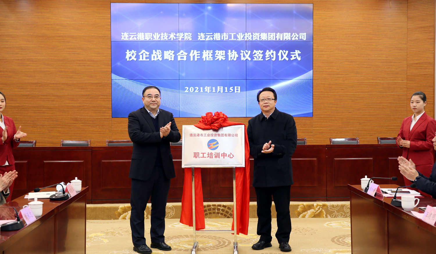 為深入推進(jìn)產(chǎn)業(yè)工人隊(duì)伍建設(shè)改革,搭建職工教育培訓(xùn)平臺(tái),115日,在連云港職業(yè)技術(shù)學(xué)院舉行校企合作簽約儀式,并為集團(tuán)公司職工培訓(xùn)中心揭牌。集團(tuán)公司黨委書(shū)記、董事長(zhǎng)楊龍,工會(huì)主席劉承志,總經(jīng)濟(jì)師陳如軍;連云港職業(yè)技術(shù)學(xué)院黨委副書(shū)記、校長(zhǎng)駱汝九,副校長(zhǎng)葛仁福、汪建明等領(lǐng)導(dǎo)出席活動(dòng)。