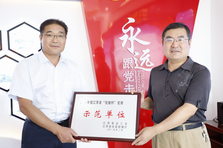 調研期間,陳健為集團公司榮獲“2018年度江蘇省‘安康杯’競賽示范單位”授牌,還為祝星星“勞模創(chuàng)新工作室”授牌。