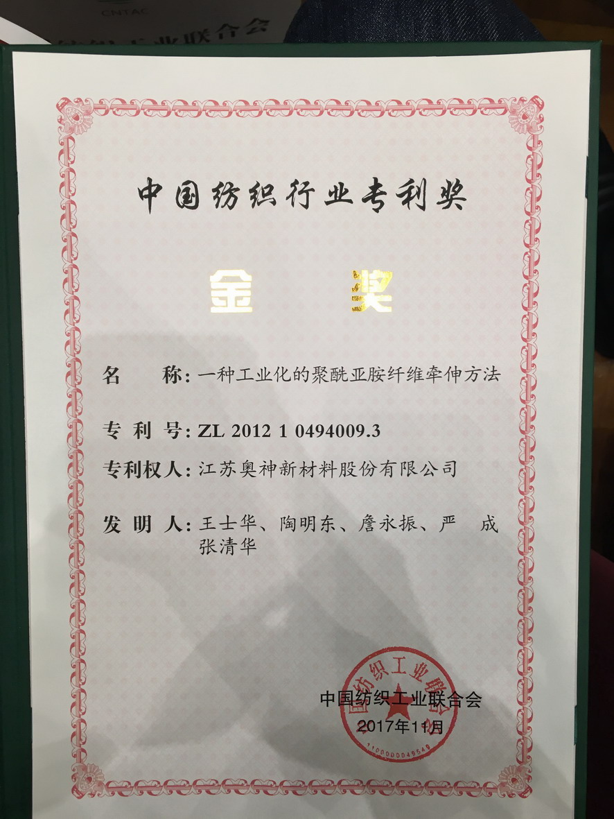 會(huì)上發(fā)布了首屆中國(guó)紡織行業(yè)專利獎(jiǎng)、全國(guó)紡織科技創(chuàng)新人才等評(píng)審結(jié)果,集團(tuán)公司副總經(jīng)理王士華獲得“全國(guó)紡織科技創(chuàng)新領(lǐng)軍人才”榮譽(yù)稱號(hào),并作為獲獎(jiǎng)代表上臺(tái)發(fā)言。江蘇奧神新材料股份有限公司發(fā)明專利“一種工業(yè)化的聚酰亞胺纖維牽伸方法”獲得首屆中國(guó)紡織行業(yè)專利獎(jiǎng)金獎(jiǎng)。
