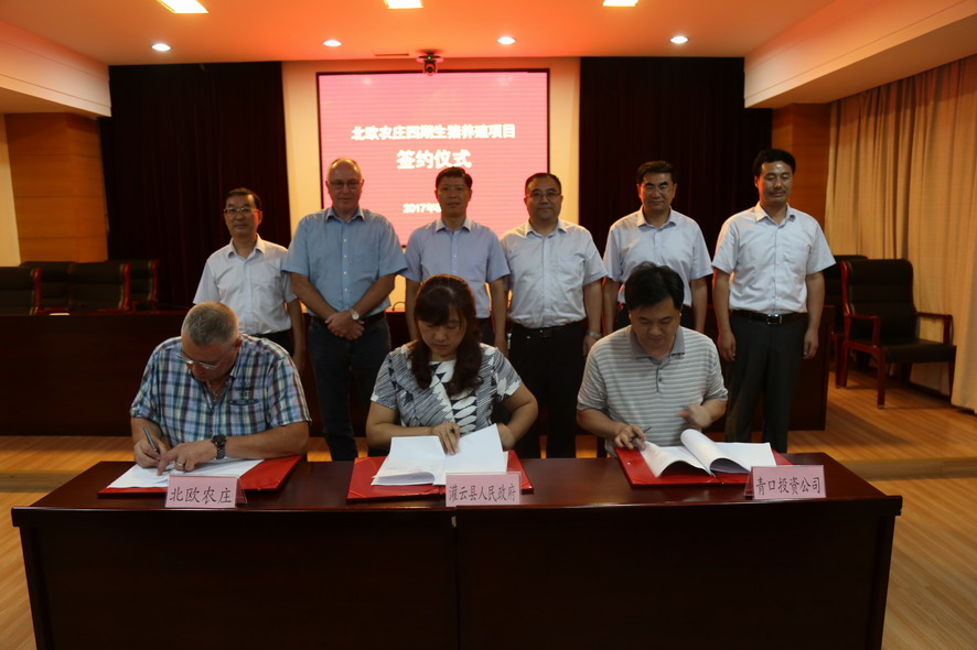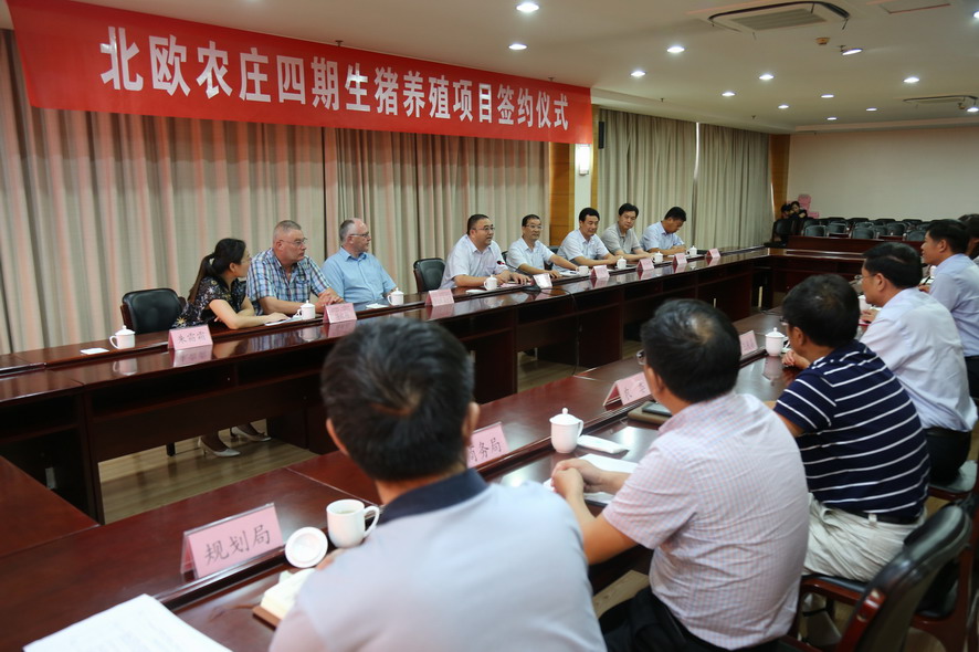 8月7日下午,北歐農(nóng)莊四期生豬養(yǎng)殖項(xiàng)目簽約儀式在灌云縣行政中心舉行。集團(tuán)公司領(lǐng)導(dǎo)楊龍、胡建明、陳如軍,灌云縣領(lǐng)導(dǎo)朱興波、王慶嘉、張凌云,丹育公司董事勞倫斯·桑德高,連云港北歐農(nóng)莊生豬養(yǎng)殖有限公司首席執(zhí)行官楊林柏等出席簽約儀式。