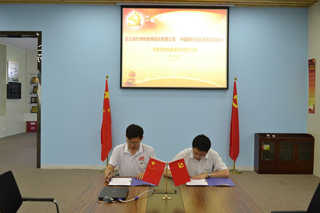 6月29日上午,杜鐘氨綸公司與中行連云港開發(fā)區(qū)支行舉行黨建共建及廉潔伙伴協(xié)議簽約儀式。儀式上,中行連云港開發(fā)區(qū)支行行長(zhǎng)介紹了分行的基本情況、經(jīng)營(yíng)管理情況、黨建和黨風(fēng)廉政建設(shè)情況。