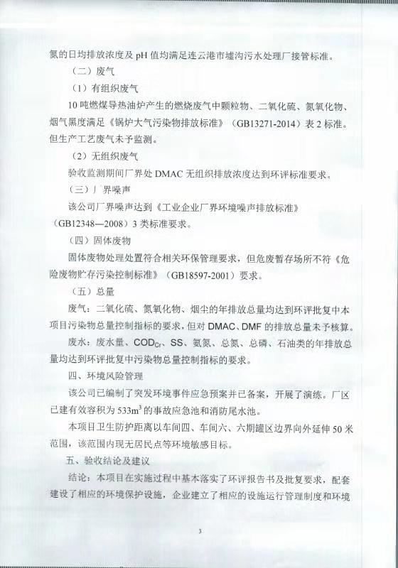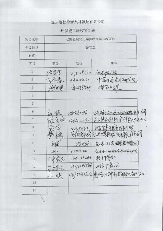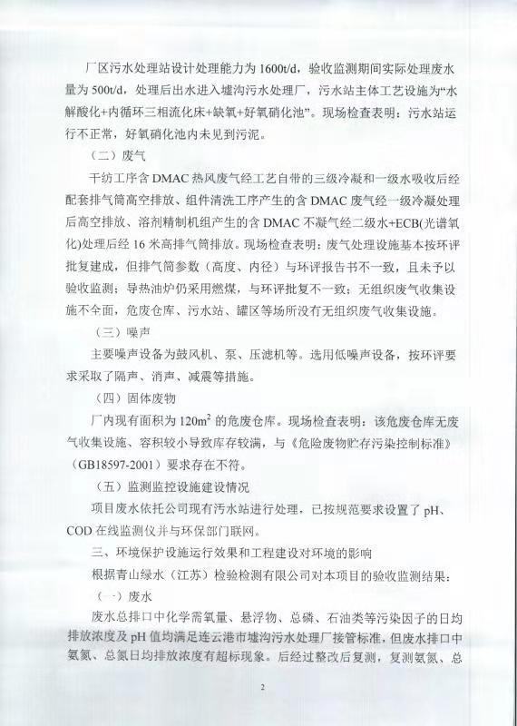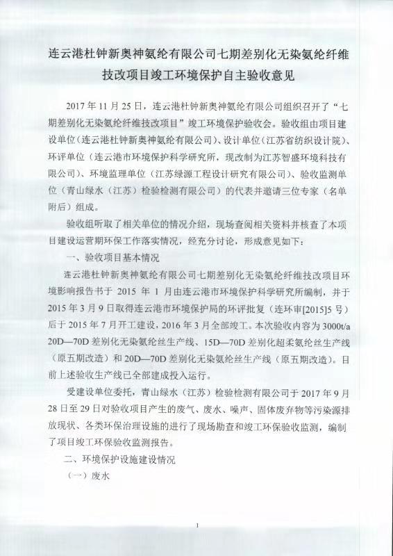 七期差別化無染氨綸纖維技改項(xiàng)目竣工環(huán)境保護(hù)自主驗(yàn)收意見