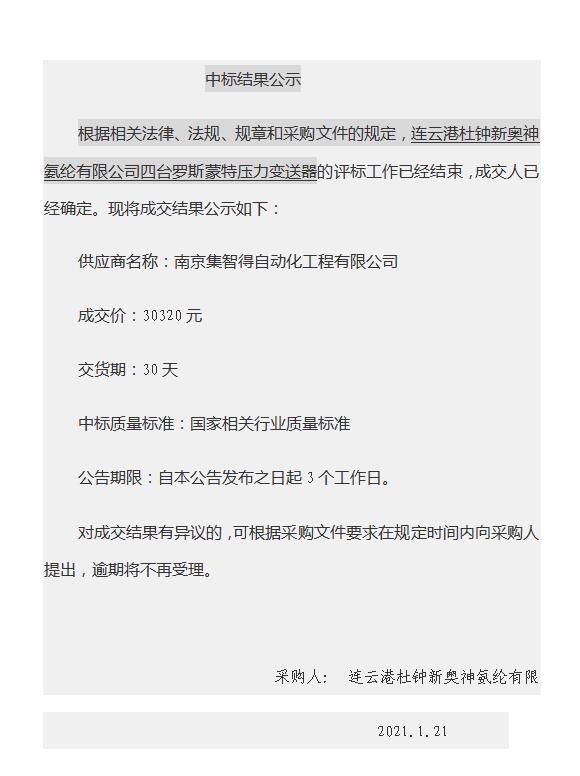 壓力變送器招標(biāo)公示