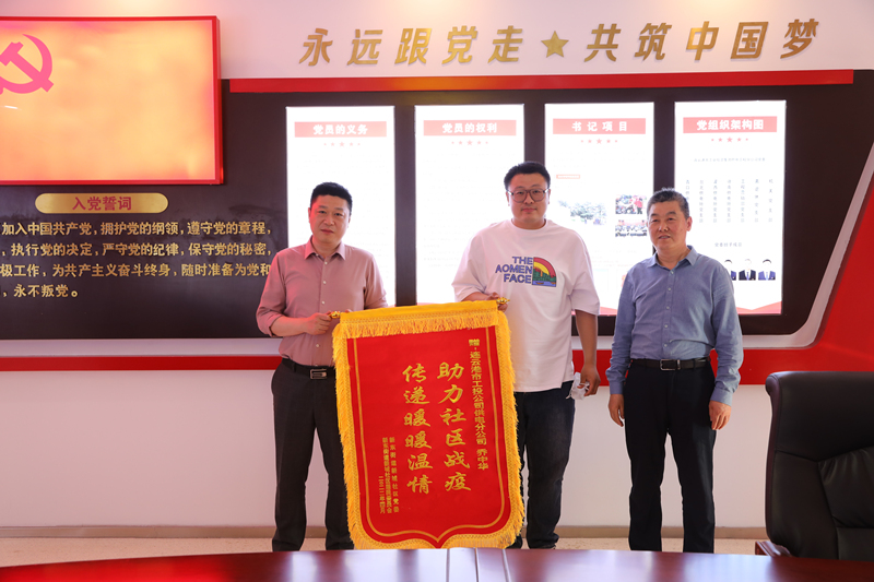 5月5日下午,新東街道新城社區(qū)居委會工作人員來到公司,為感謝公司黨員喬中華在該社區(qū)疫情防控期間守護(hù)居民群眾的健康安全,為打贏疫情防控阻擊戰(zhàn)發(fā)揮的積極作用,將寫有“助力社區(qū)戰(zhàn)疫 傳遞暖暖溫情”的錦旗送到公司黨委書記、總經(jīng)理宋晟曄手中。