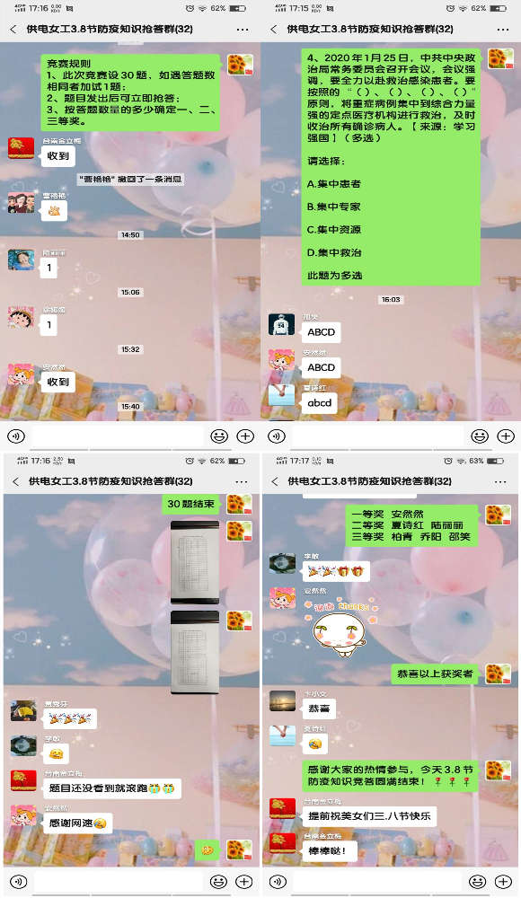 值此2020年第110個國際“三八”婦女節(jié)來臨之際,為了讓公司女職工在做好自身疫情防護的前提下,能夠度過一個健康、愉快、充實的節(jié)日,公司女工委利用微信群組織全體女職工開展了慶“三八”抗新冠疫情防護知識搶答賽活動。