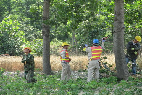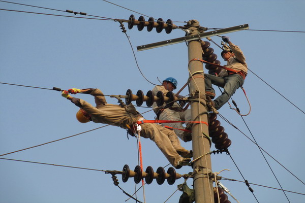該工程本需停電施工2天,為盡可能地縮短施工停電時間、方便用戶,公司事前多次組織人員現(xiàn)場勘察論證,編制施工方案,召開施工專題會議,提前到現(xiàn)場進行技術交底。施工當天,公司組織灌西、徐圩、臺北、臺南、青口等五個供電所150職工,參與大會戰(zhàn);清晨天剛放亮,公司領導和參戰(zhàn)職工就已趕到施工現(xiàn)場。 施工現(xiàn)場地形復雜,跨越路口8處、河線4處、通訊線光纜5處、10KV和0.4KV帶電線路7處,蝦塘10處。公司統(tǒng)一調度,分工協(xié)作,同步展開。在施工現(xiàn)場,指定了專職安全員,各道路、線路跨越處搭設了防護架,設置了臨時警示牌和警示欄,收緊線過程中進行巡線,確保施工安全。中午,公司在淮鹽大酒店制作工作簡餐,送到工地,施工人員抽空輪流進餐后,就繼續(xù)接著施工,并一直忙到晚上9點。