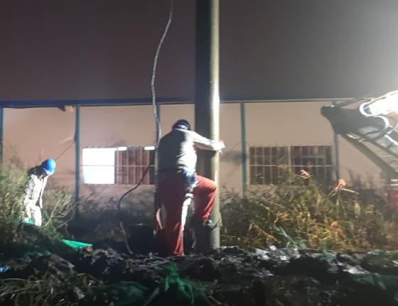 今年的10月天氣還是熱的厲害,電桿被太陽曬的滾燙,搶修人員臉上掛滿了豆大的汗珠,工作服已經(jīng)全部濕透。為了搶時(shí)間,抓進(jìn)度,作業(yè)人員們?nèi)徊活?,依然緊張有序地工作著?,F(xiàn)場搶修工作涉及吊車、挖掘機(jī)等大型施工機(jī)具,安全管控尤為重要,現(xiàn)場所有搶修人員在工作負(fù)責(zé)人的指揮下平穩(wěn)有序的推進(jìn)搶修工作,吊車擺放位置、挖掘機(jī)挖桿洞的位置等每一個關(guān)鍵工作點(diǎn)都在搶修人員的嚴(yán)格監(jiān)督下進(jìn)行,不敢有絲毫松懈。就在這時(shí),天公不作美,突然下起了大雨,可是大雨并沒有攔住搶修工作。臺北供電所現(xiàn)場所有的搶修人員在錢所長的帶領(lǐng)下,穿著濕透的工作服在雨中指揮挖掘機(jī)開挖桿洞、組立電桿、連接導(dǎo)線-------搶修人員在天昏地暗的雨中穿梭,雨水和汗水交匯在電力搶修人員的臉龐上,大家都來不急擦拭一下臉上的雨水,在雨中忙碌著。經(jīng)過4個半小時(shí)的緊張有序搶修,晚上19:30分10KV港北線恢復(fù)供電。