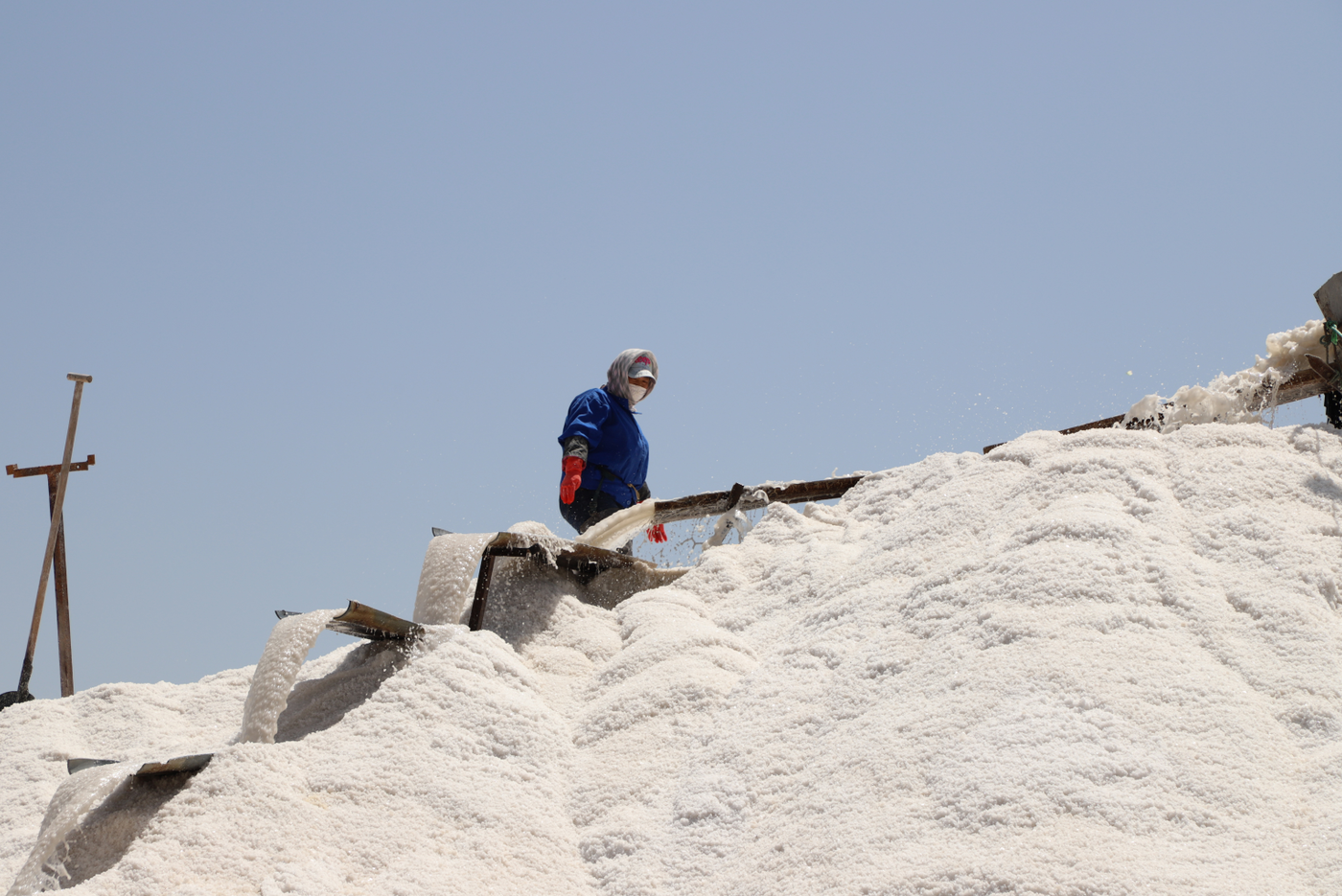 在新河十一班,扒鹽工作正在緊張的進行之中,兩名員工在鹽廩上揮舞著木鍬,搬送著淌鹽的導(dǎo)流板做鹽廩,扒鹽員工跟時間賽跑,24小時不停機3班倒開機扒鹽,緊緊抓住當前生產(chǎn)經(jīng)營的黃金季節(jié),搶抓扒鹽進度,堅決實現(xiàn)時間任務(wù)雙過半。