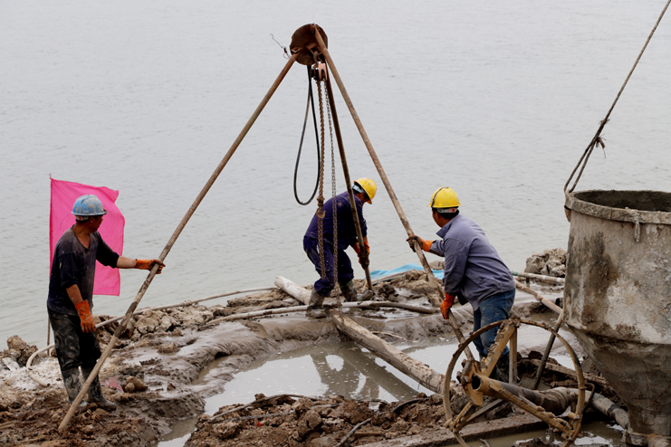 5月30日下午,藍(lán)色的天空沒有一絲云彩,火熱的太陽炙烤著大地。在灌西投資公司五灌河碼頭擴(kuò)建項(xiàng)目建設(shè)工地,施工人員正在各司其職的工作著,有的在使用電鋸,有的在壓鋼筋,還有的在焊接鋼筋框架。遠(yuǎn)處一臺(tái)混凝土澆灌機(jī)在進(jìn)行混凝土澆灌作業(yè),碼頭岸邊大小打樁機(jī)器一字排開,筆者親身感受五灌河碼頭二期工地開發(fā)建設(shè)的火熱場面。