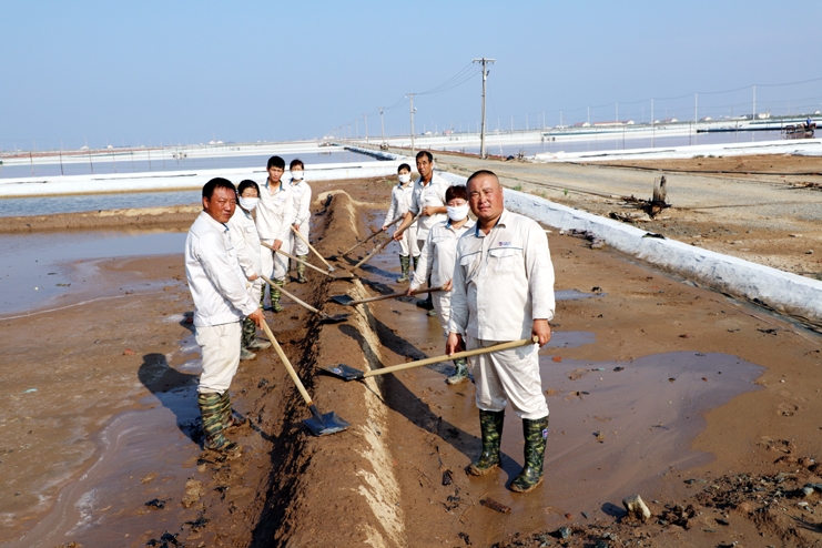 趁著休息的間隙,筆者與身邊忙得滿頭大汗的8班班長祝星星聊了起來。據(jù)祝星星介紹,每天員工4點(diǎn)半就到灘頭,進(jìn)行鹽池的人工活碴、稟基修復(fù)、鹽池鹵水補(bǔ)充、收放設(shè)備檢查等一系列工作,因此,合理安排工作量非常重要。他告訴筆者,室外工作工人的勞保服比較厚,一天下來工作服濕了又干,干了又濕,衣服上都泛出厚厚的鹽漬。一天下來,全班要消耗2大桶甚至更多的飲用水。現(xiàn)在公司里對我們一線生產(chǎn)崗位員工非常關(guān)心,防暑降溫工作非常到位。最近,單位又為我們發(fā)放高溫津貼、電風(fēng)扇、防暑降溫藥品。這些讓我們員工真切感受到組織的力量,組織得偉大,所以雖說現(xiàn)在比平時(shí)更辛苦,我們有信心戰(zhàn)高溫、奪高產(chǎn)。