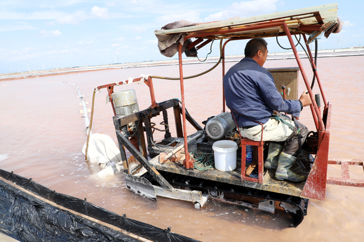 筆者在走訪時看到,在新河制鹽分公司10班的鹽池內(nèi),一臺輕型自吸式電動履帶“T30”正在進(jìn)行帶鹵扒鹽,大池道上抽鹽機(jī)泵的轟鳴聲回蕩在鹽灘上,不遠(yuǎn)處另外幾個扒鹽機(jī)組也在不停的忙碌著。