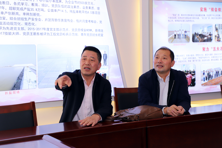 檢查組一行先后到新河制鹽分公司、老機關(guān)新建黨建室進行實地檢查驗收,在新河制鹽分公司黨建活動室,江舜軍部長一行詳細聽取了該黨支部書記李加新對黨建工作的匯報,隨后,在老機關(guān)綜合黨員活動中心,檢查組一行利用活動室電子顯示屏觀看了集團司歌視頻。