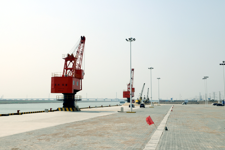 在五灌河碼頭現(xiàn)場,302米長的碼頭平臺上,2座20多米高的紅色座吊一字排開,在河水的映照下顯得格外“威武”。據(jù)碼頭工作人員介紹,這兩座吊機剛剛安裝并調試完畢,它們是五灌河碼頭運營的最基本條件之一,一座25噸,另一座40噸,運出貨物將通過這兩座吊機完成。