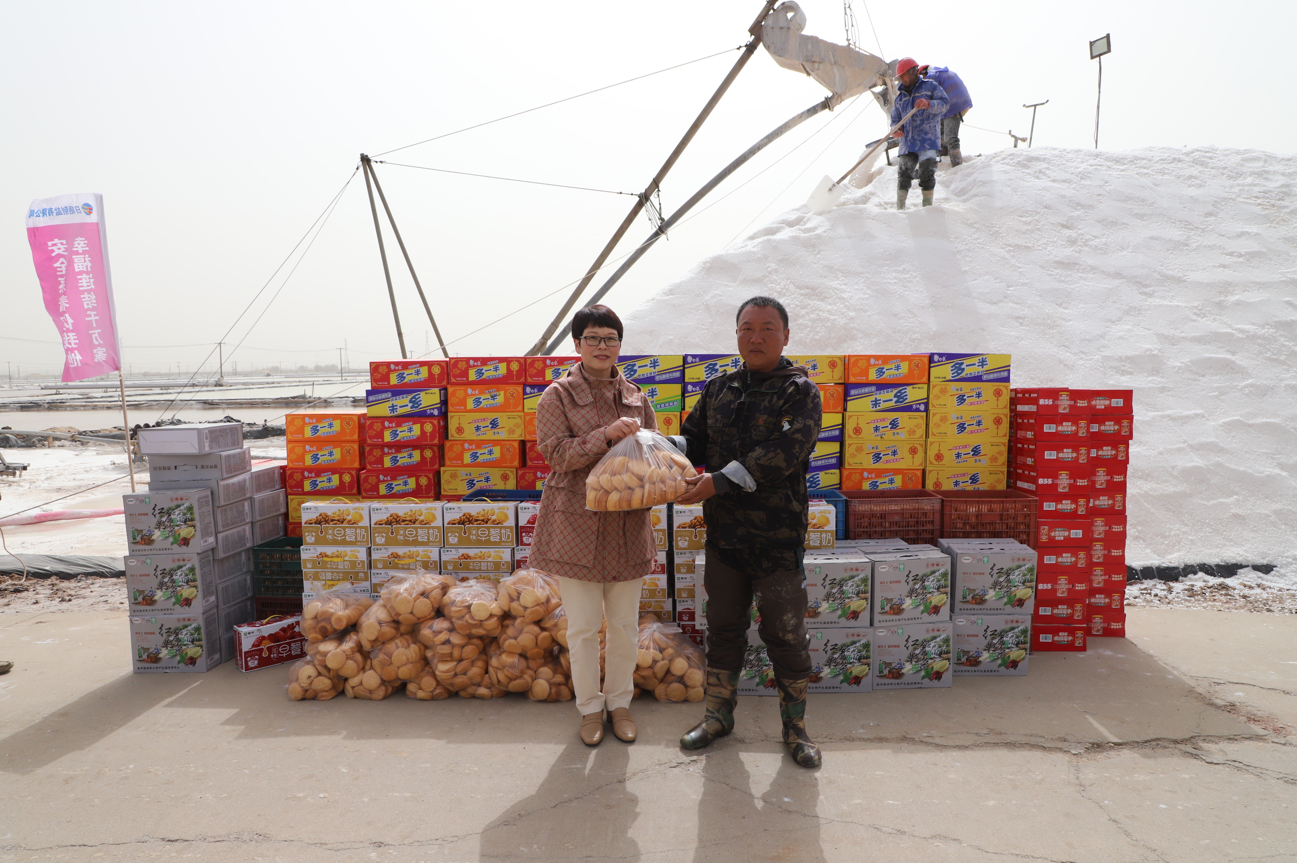 “你們辛苦了,我代表公司來看望大家?!痹谛潞泳虐嗯c埒南九班,王宏與扒鹽現(xiàn)場(chǎng)職工握手問好,感謝他們?cè)谶^去的一年為日曬制鹽公司的原鹽生產(chǎn)所付出的辛勤努力,叮囑他們一定要落實(shí)落細(xì)扒鹽生產(chǎn)措施,增強(qiáng)責(zé)任感和警覺性,嚴(yán)格執(zhí)行各項(xiàng)規(guī)章制度,切實(shí)保障扒鹽期間的安全生產(chǎn),并送上雞蛋、八寶粥、方便面、牛奶等物品。