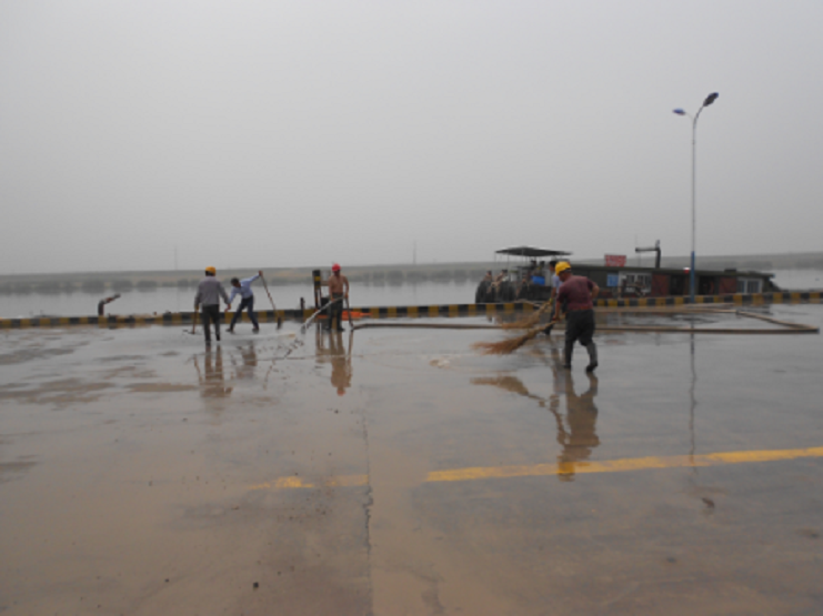 近期由于五灌河水位下降,給??看a頭的船只帶來了很大的安全隱患,于是公司決定對碼頭岸線的河道進(jìn)行一次清淤工作,在清淤的運(yùn)輸過程中使碼頭作業(yè)區(qū)一片狼跡,為了不影響宏港石化的PPA噸袋的吊裝業(yè)務(wù),6月11日上午公司班子成員主動放棄休息日與上班工人一道對碼頭作業(yè)區(qū)進(jìn)行清理,他們有的用水槍沖,有的用掃帚掃,經(jīng)過二個多小時(shí)的奮戰(zhàn),作業(yè)區(qū)場地上渙然一新。(宵洋葛高平)