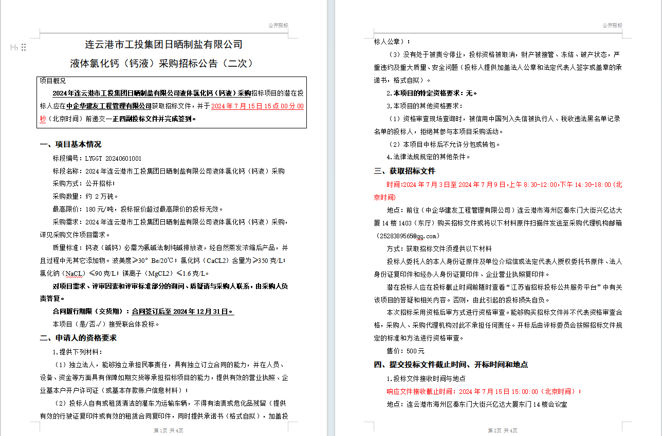 連云港市工投集團(tuán)日曬制鹽有限公司液體氯化鈣(鈣液)采購招標(biāo)公告(二次)