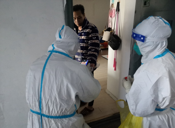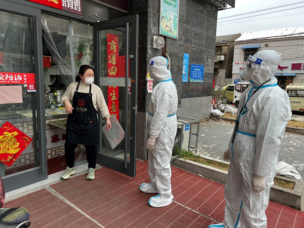 公司員工范益楊、李夢達是集團抗疫志愿隊的隊員。在冷冽寒風中,他倆身穿防護服挨家挨戶通知商戶暫停營業(yè),同樣的通知話語不厭其煩的重復(fù)著一遍又一遍,說得口干舌燥、疲憊不堪也未能阻攔他們繼續(xù)前進的腳步。