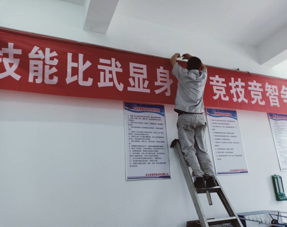? ? ? ? ??為營造技能大賽氛圍,7月7日上午,品質(zhì)管理部特地請(qǐng)維修組件班組朱師傅、王師傅在品質(zhì)管理部辦公區(qū)掛上宣傳橫幅。維修組件班組的兩位師傅不怕麻煩,多次調(diào)整橫幅的角度,力求做到盡善盡美,為營造技能大賽氛圍貢獻(xiàn)自己的力量。