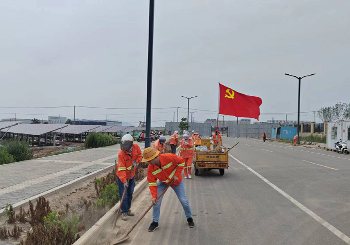6月21日,該黨支部近30余名黨員在支部的感召下,匯集于新區(qū)節(jié)能一路道路兩邊。勞動現(xiàn)場,黨員生產(chǎn)骨干姚功身先士卒,無懼泥土粉塵揚(yáng)起,揮汗清理,不怕臟、不怕累,不放過任何衛(wèi)生死角。勞模張學(xué)軍與老黨員徐習(xí)東相互配合,打包,裝車, 及時轉(zhuǎn)運(yùn)各類垃圾達(dá)50多袋,清掃路面積土近1500米長,大家分工明確,重活臟活搶著干。隊(duì)員們齊心協(xié)力,用實(shí)際行動詮釋黨員吃苦在前、勇于擔(dān)當(dāng)?shù)姆瞰I(xiàn)精神。經(jīng)過四個多小時清理,主干道及周邊道路垃圾、雜草、泥土全部清理干凈,高質(zhì)量完成奉獻(xiàn)勞動,鮮艷的黨旗在陽光的照耀下顯得格外閃亮。(楊波)