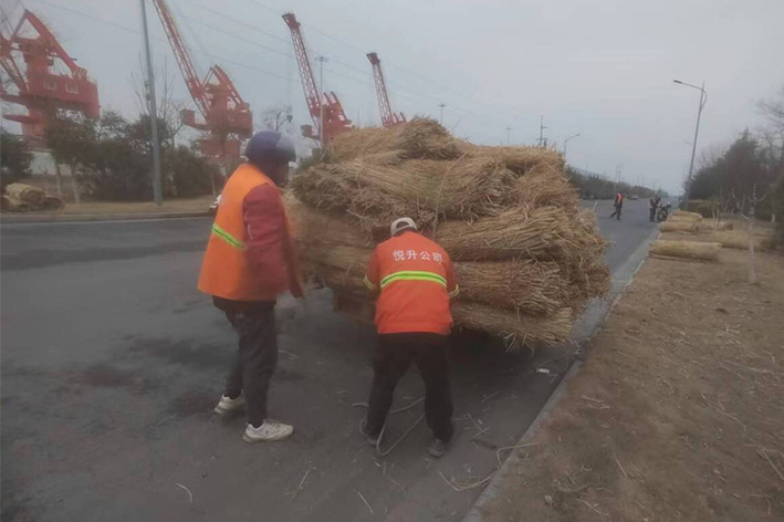 實時拆除防寒設(shè)施。隨著氣溫的逐漸升高,為使苗木更好、更快的返青,前期瑞南二個綠化班組緊鑼密鼓,積極準備,搶抓時機,3月中旬對云港路、金港路、228等道路兩側(cè)夾竹桃等綠植防寒草簾進行拆除工作,并對去冬枯枝干葉安排修剪。