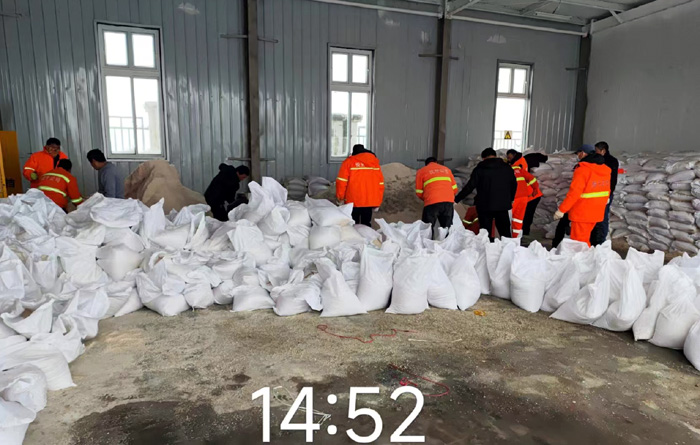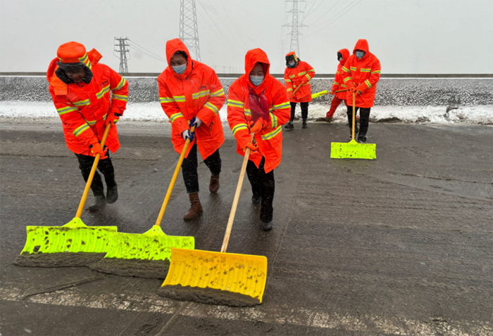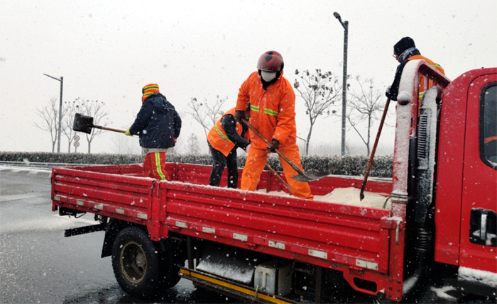 悅升公司按照責(zé)任分工,分包路段、分配任務(wù),出動(dòng)除雪機(jī)械設(shè)備,夜以繼日、奮戰(zhàn)一線,緊張有序地開(kāi)展道路冰雪清除工作。本次出動(dòng)保障人員160余名,兵分7路,2路裝卸隊(duì)負(fù)責(zé)將提前采購(gòu)好的200多噸融雪劑有序裝車,5路道路保障隊(duì)負(fù)責(zé)各自區(qū)域內(nèi)的冰雪清除。保障人員克服地面濕滑、氣溫驟降等不利因素,秉承“減存遏增”的理念,各路段按照人工+機(jī)械的方式,采取“邊下雪邊除雪”的工作模式,共出動(dòng)2輛雪輥車、4輛大雪鏟車、1臺(tái)撒播機(jī)、運(yùn)雪皮卡和廂貨車共11輛,循環(huán)開(kāi)展除雪作業(yè),各組之間配合默契,大大提高了工作效率。