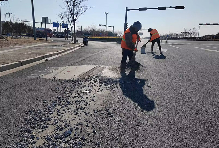 燈塔路路口,巡查人員發(fā)現(xiàn)大面積車(chē)輛拋灑物,生產(chǎn)骨干張學(xué)軍、徐習(xí)東、陸永柱接到公司應(yīng)急處理電話第一時(shí)間趕赴現(xiàn)場(chǎng),盡管天氣寒冷,但是大家干的熱火朝天,共清理泥塊30多處,長(zhǎng)達(dá)800多米長(zhǎng);轉(zhuǎn)運(yùn)石子、石塊50多車(chē),他們?cè)俅斡眯袆?dòng)彰顯黨員示范風(fēng)采。